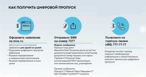 В Москве существует несколько способов получения пропуска через СМС-сервис 7377. Важно отметить, что пропуск может быть получен только в случае необходимости официального перемещения в периоды ограничения передвижения.