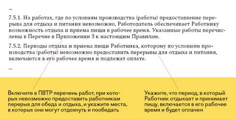Важно помнить, что работникам должны быть предоставлены все необходимые условия для отдыха и питания во время перерывов, включая возможность посещения столовых или обеденных помещений.